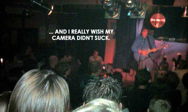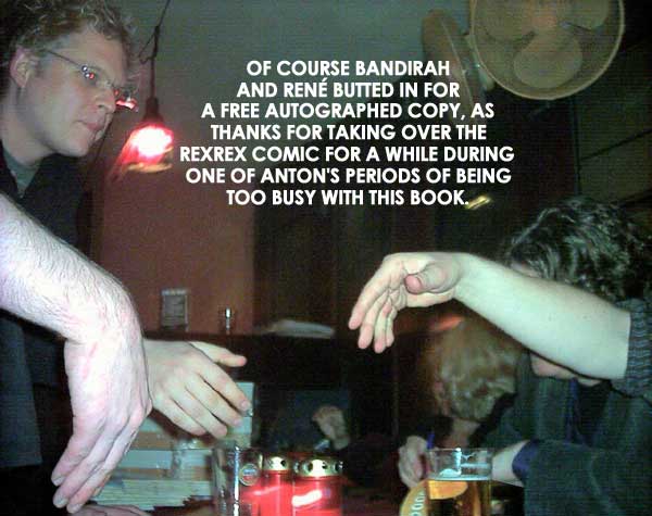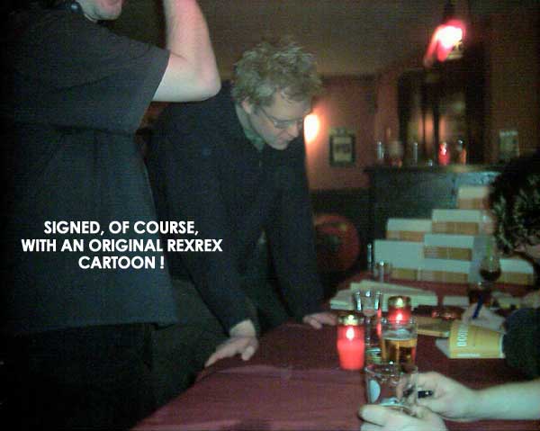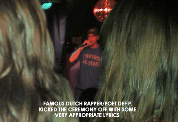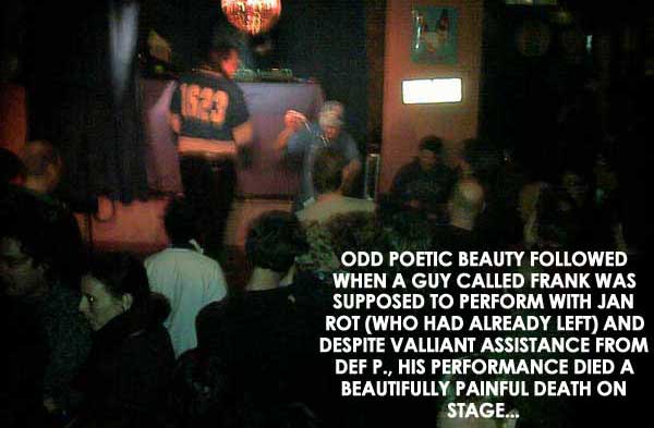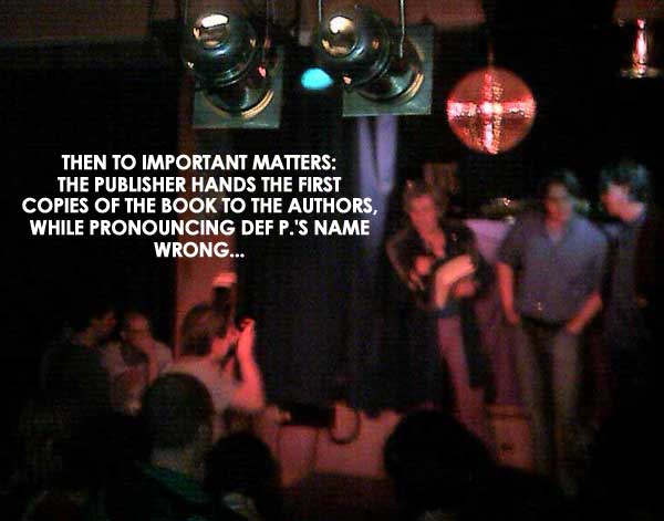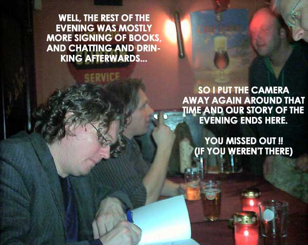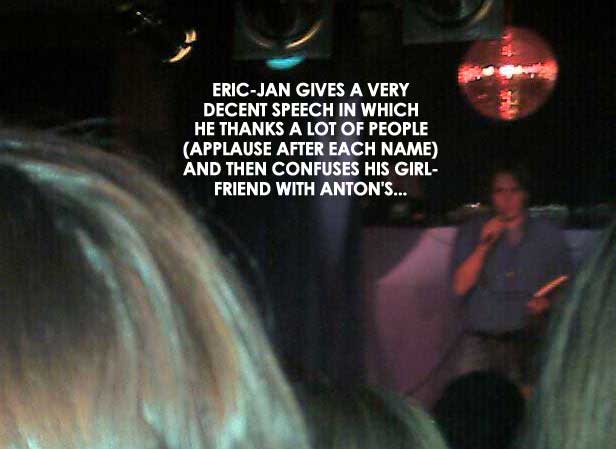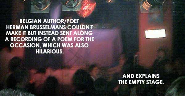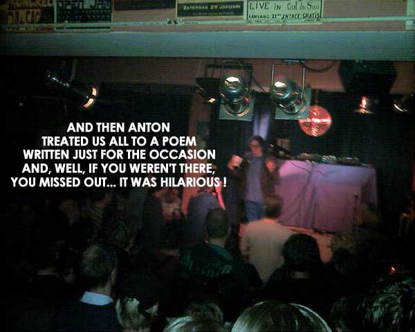 November 21st, 2004: Eric-Jan van Gorkum and Anton Dautzenberg (aka Troy Titane) had the presentation for their book "Doodspraak" in bar Cul de Sac, Tilburg (see also our news article about it). As could be expected, we're giving you a photo report of the evening - however, I found out at home that my camera was on close-up setting so everything on the stage came out blurry.. I apologise for this.